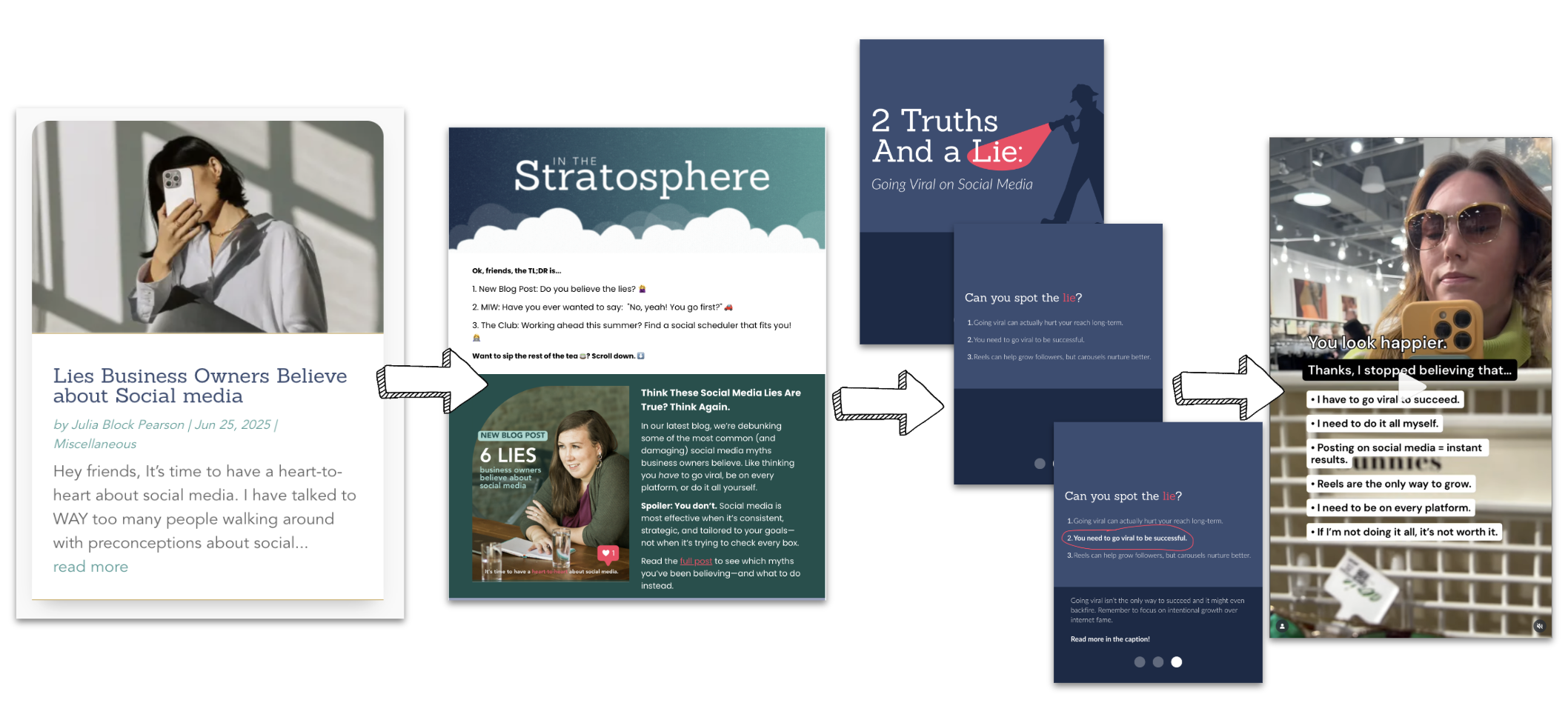 - Turn it into a video. Could you film yourself sharing the main takeaway? Or record a behind-the-scenes moment and overlay text? Now you have post #4.